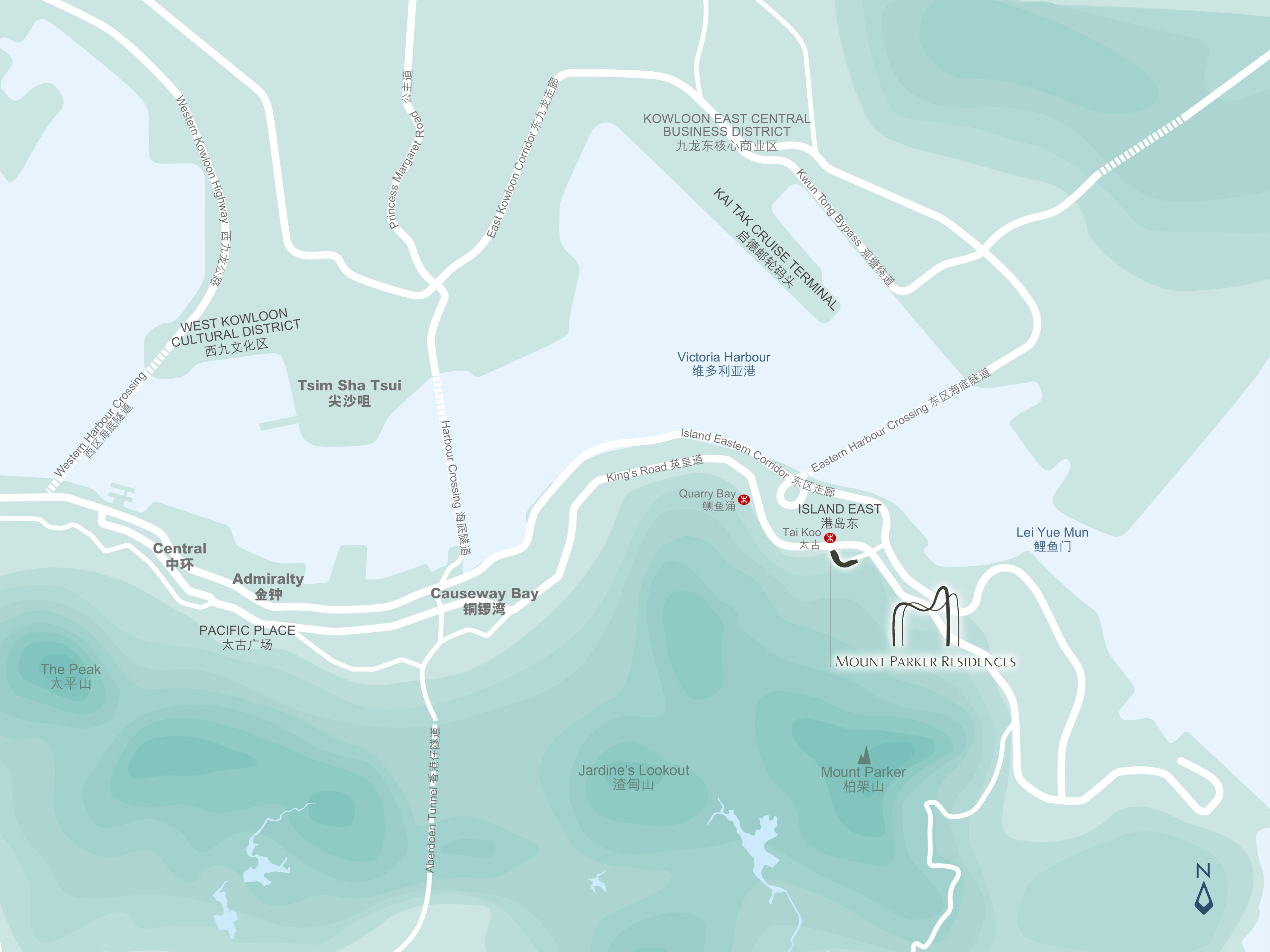 MOUNT PARKER RESIDENCES交通网络完善八达,由东区走廊及东区海底隧道两条主要干道接连中环及九龙东核心商业区;步行5分钟到达港铁太古站。
